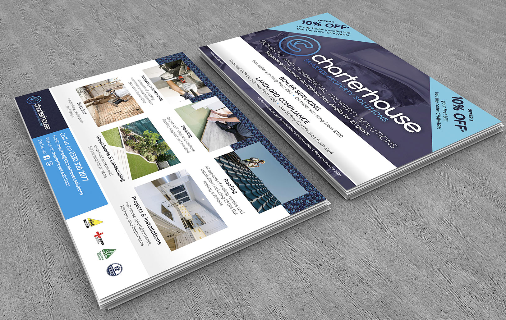 Charterhouse Property Solutions partnered with Level Up Print to develop a new brand identity and a suite of high-quality printed materials designed to communicate their professionalism, expertise, and modern approach to property management and maintenance.